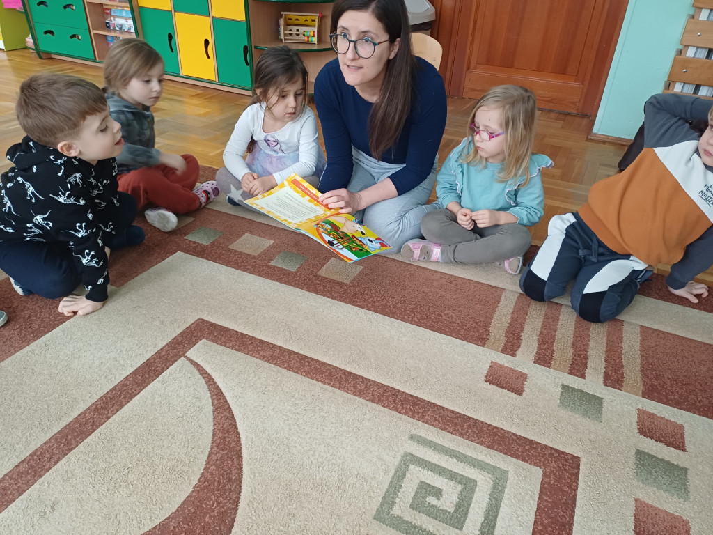 Dzieci z wielkim zainteresowaniem słuchały czytanych opowieści i chetnie oglądały kolorowe ilustracje oraz wypowiadały się na temat przygód bohaterów.