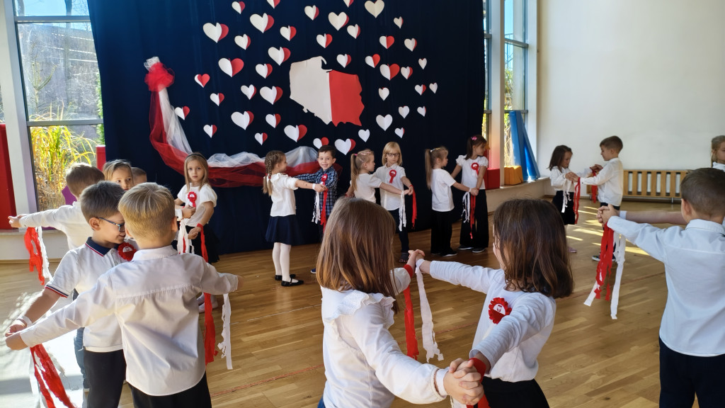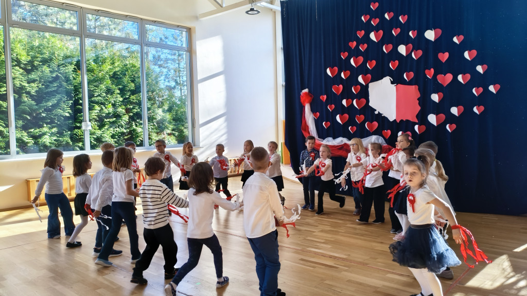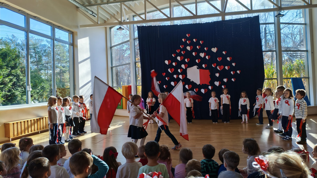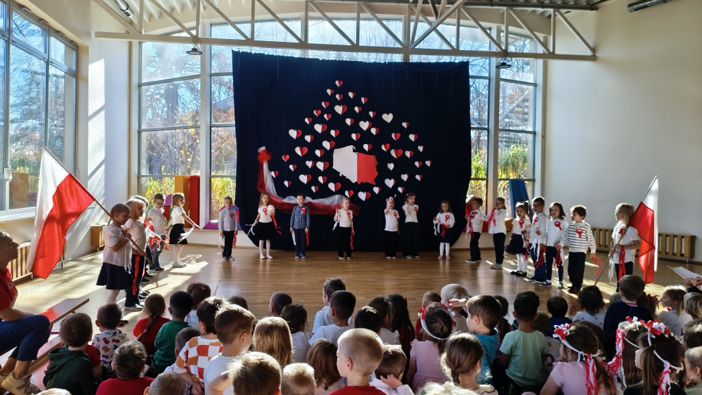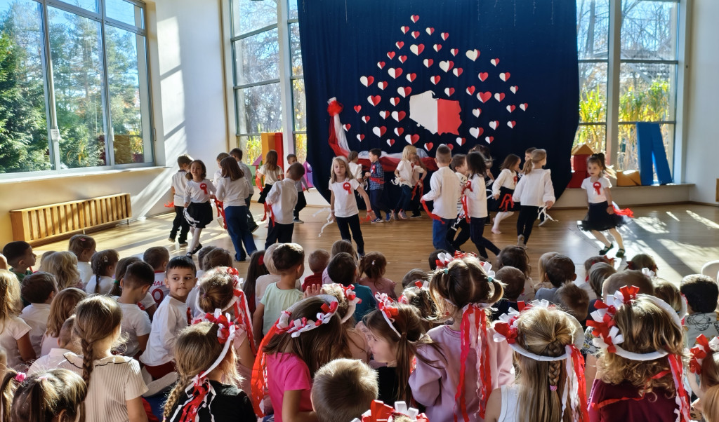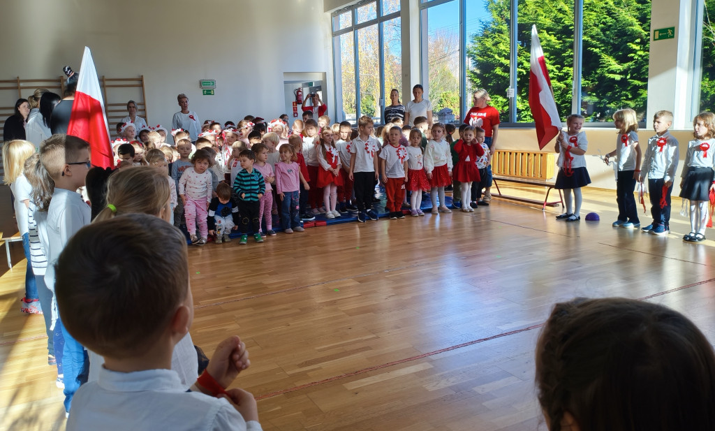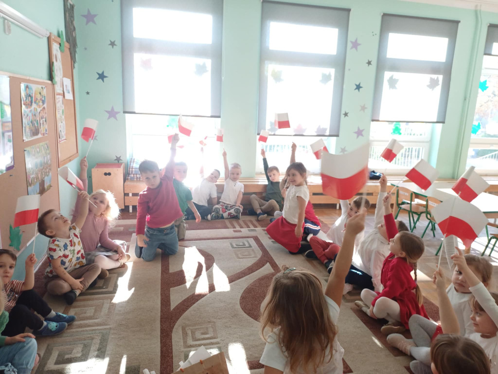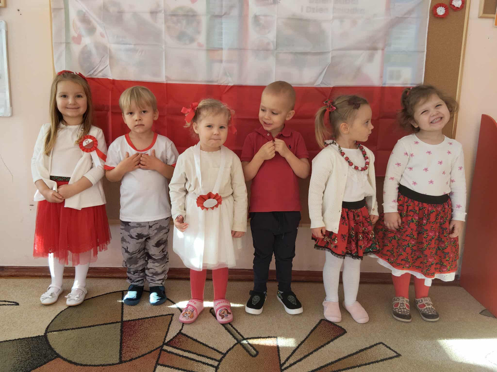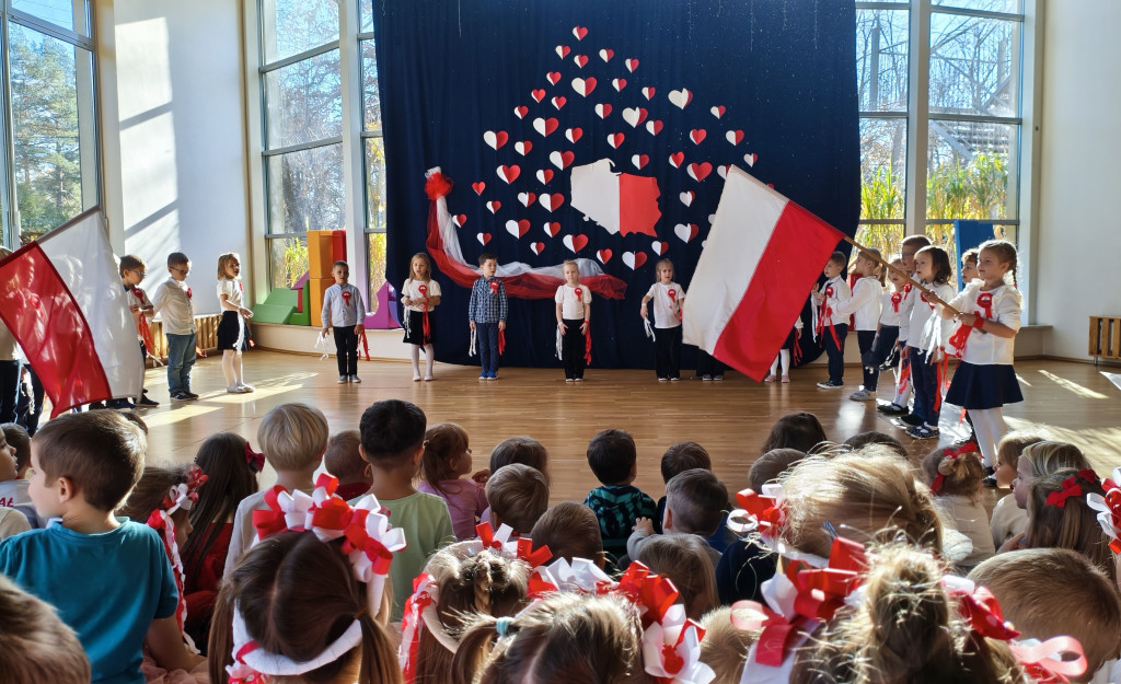 Przedszkolaki lubią świętować, więc obchody Dnia Niepodległości rozpoczęliśmy już dziś. Przed południem wszystkie grupy spotkały się na sali widowiskowo-sportowej. Dzieci z grupy „Pszczółki” przedstawiły piękny program artystyczny, w którym w prosty, zrozumiały dla młodych odbiorców sposób, opowiedziały historię odzyskania przez Polskę niepodległości. Nie zabrakło oczywiście odśpiewania hymnu narodowego przez wszystkie Przedszkolaki. To było radosne, patriotyczne święto.
