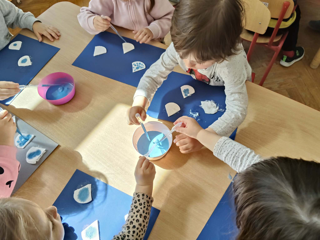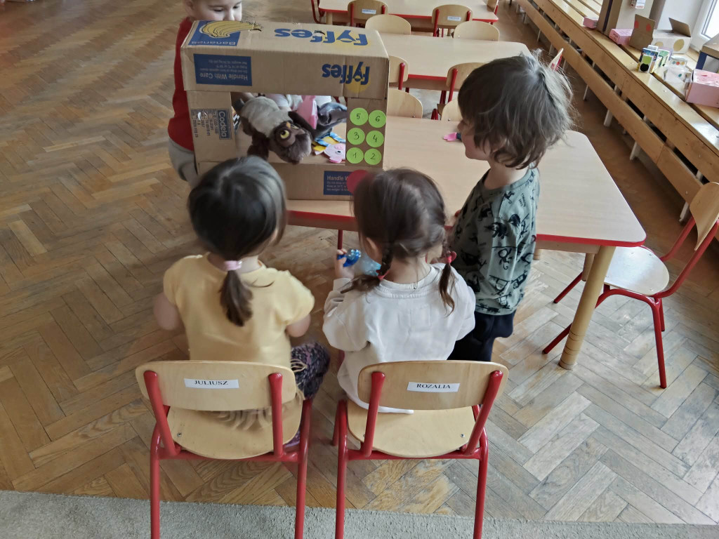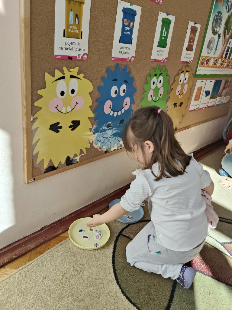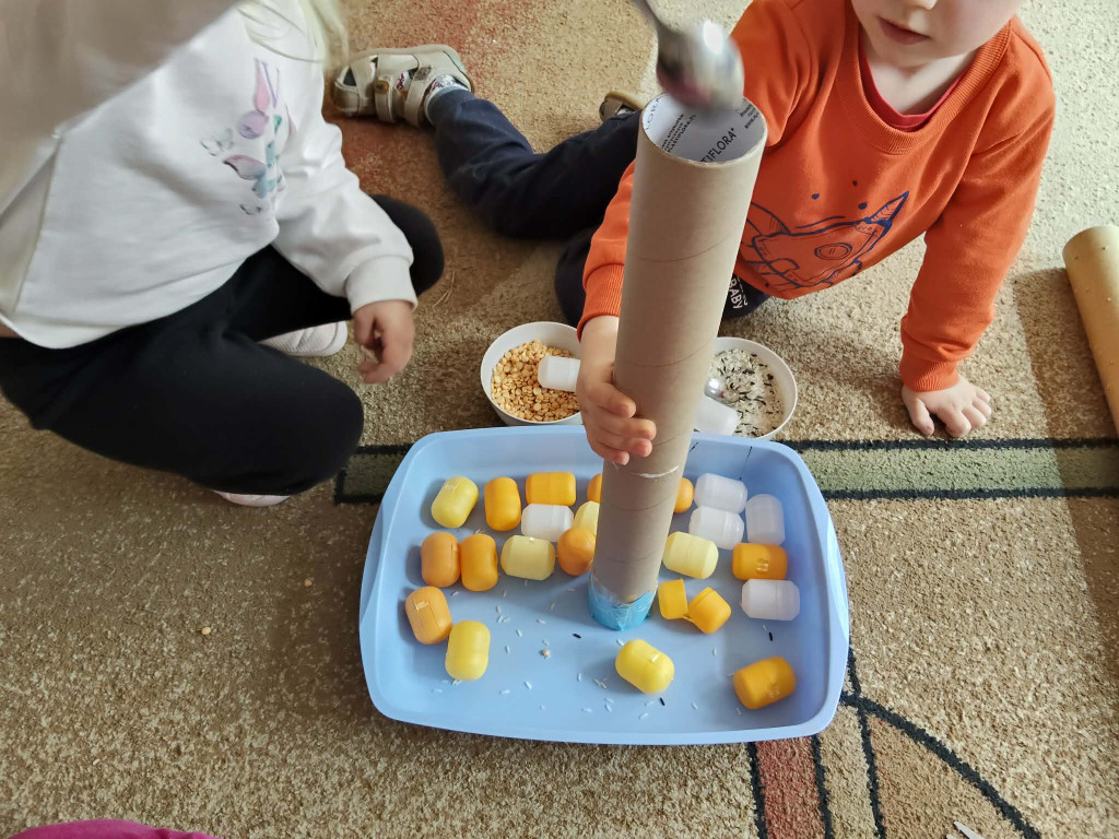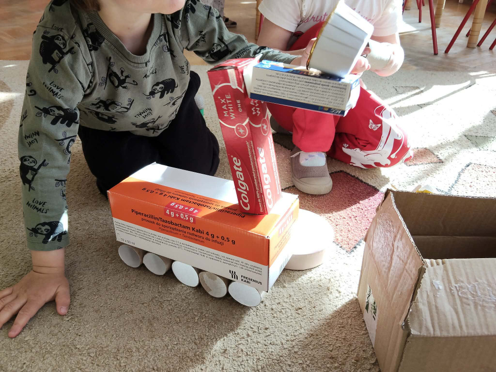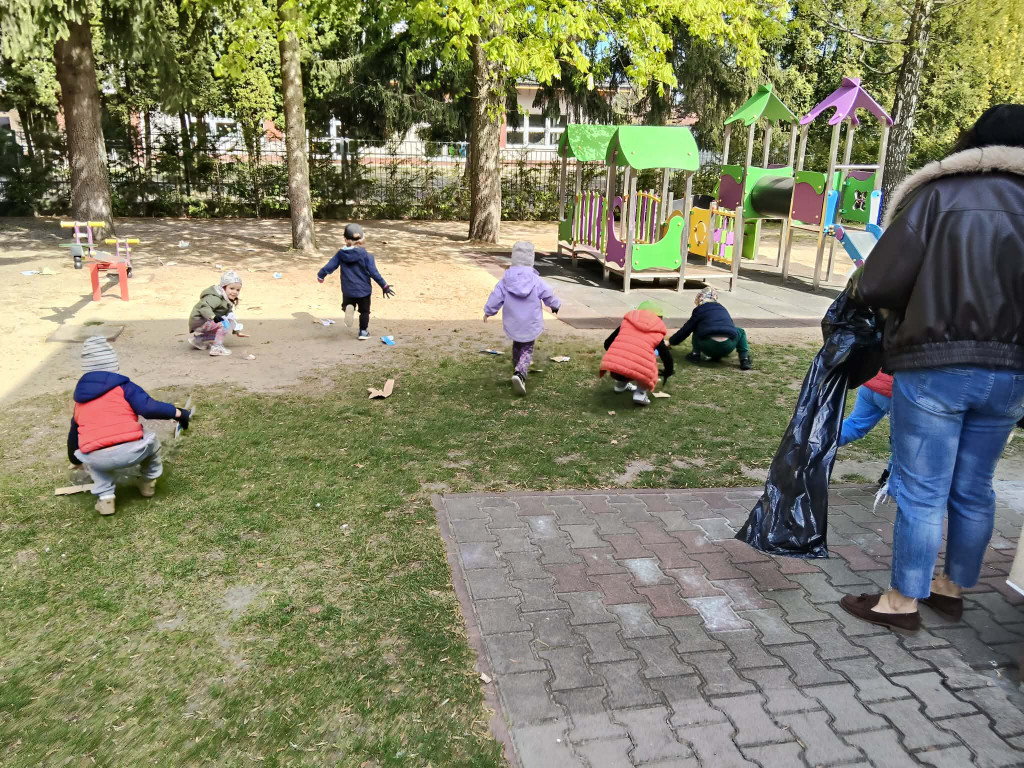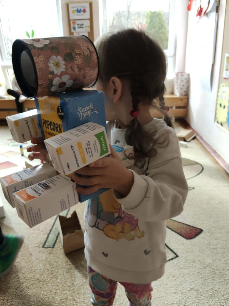 W tym tygodniu obchodziliśmy Światowy Dzień Kreatywności oraz Dzień Ziemi. Łącząc te dwa zagadnienia Biedronki wzięły udział w szeregu aktywności proekologicznych. Oglądając film edukacyjny pt. „Dzień Ziemi”, a także śpiewając piosenki dowiedzieliśmy co to znaczy, że „cały świat jest w naszych rękach”. Segregując śmieci nakarmiliśmy Śmieciaki, które w tym tygodniu zamieszkały w naszej sali. Z kartonowych pudełek przyniesionych przez dzieci stworzyliśmy rozmaite zabawki, grę planszową, a także telewizor, w którym dzieci prezentowały bajki pacynkowe. Plastikowe butelki z kolei posłużyły nam do muzykowania. Poznaliśmy nowe instrumenty: kalimbę, kerę i kij deszczowy. Wykonaliśmy również własne instrumenty – kij deszczowy z rolki po ręcznikach papierowych, oraz grzechotki z jajek niespodzianek, grochu i ryżu. Najbardziej do gusty przypadły dzieciom zabawy wodą przy użyciu zakraplaczy. Zwieńczeniem naszych ekologicznych aktywności było posprzątanie placu zabaw z papierów, które psotnik wiatr rozniósł po naszym ogródku. Zrobiliśmy to w ramach akcji Gminnego Sprzątania naszej okolicy.