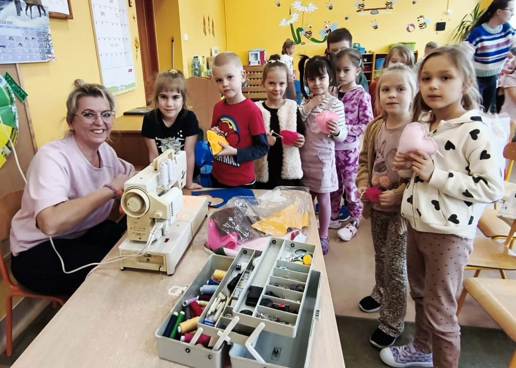 Podczas spotkania dzieci poznały podstawowe narzędzie krawieckie: nożyce, naparstki igły, szpilki, centymetr krawiecki, mydełko, guziczki i oczywiście nitki. Na oczach dzieci powstał woreczek oraz serduszko materiałowe.